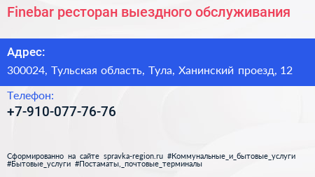 Finebar, ресторан выездного обслуживания по адресу 300024, Тульская область, Тула, Ханинский проезд, 12 в дальнейшем Организация, размещена в следующих категориях: