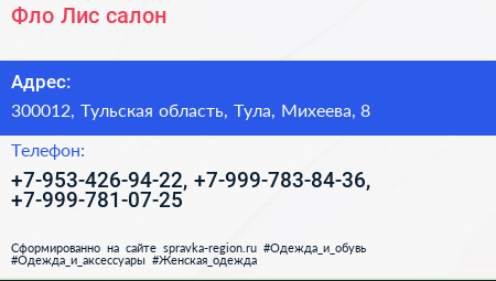 Фло Лис, салон по адресу 300012, Тульская область, Тула, Михеева, 8 в дальнейшем Организация, размещена в следующих категориях:
