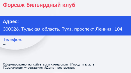 Форсаж, бильярдный клуб по адресу 300026, Тульская область, Тула, проспект Ленина, 104 в дальнейшем Организация, размещена в следующих категориях: