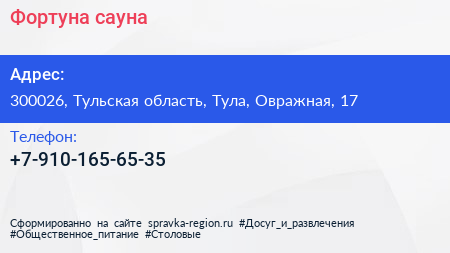 Фортуна, сауна по адресу 300026, Тульская область, Тула, Овражная, 17 в дальнейшем Организация, размещена в следующих категориях: