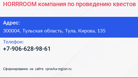 HORRROOM, компания по проведению квестов по адресу 300004, Тульская область, Тула, Кирова, 135 в дальнейшем Организация, размещена в следующих категориях: