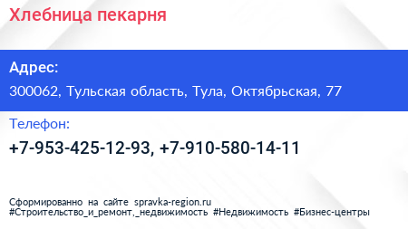 Хлебница, пекарня по адресу 300062, Тульская область, Тула, Октябрьская, 77 в дальнейшем Организация, размещена в следующих категориях: