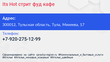 Its Hot, стрит-фуд кафе по адресу 300012, Тульская область, Тула, Михеева, 17 в дальнейшем Организация, размещена в следующих категориях: