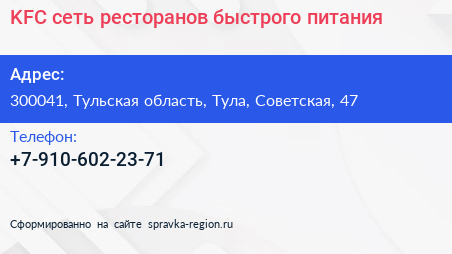 KFC, сеть ресторанов быстрого питания по адресу 300041, Тульская область, Тула, Советская, 47 в дальнейшем Организация, размещена в следующих категориях:
