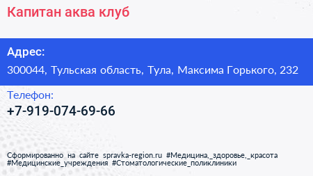 Капитан, аква-клуб по адресу 300044, Тульская область, Тула, Максима Горького, 232 в дальнейшем Организация, размещена в следующих категориях:
