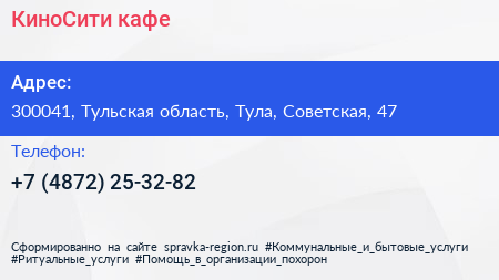КиноСити, кафе по адресу 300041, Тульская область, Тула, Советская, 47 в дальнейшем Организация, размещена в следующих категориях: