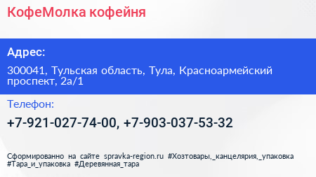 КофеМолка, кофейня по адресу 300041, Тульская область, Тула, Красноармейский проспект, 2а/1 в дальнейшем Организация, размещена в следующих категориях: