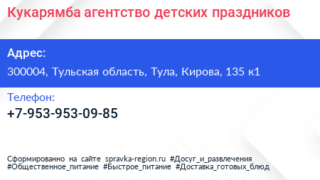 Кукарямба, агентство детских праздников по адресу 300004, Тульская область, Тула, Кирова, 135 к1 в дальнейшем Организация, размещена в следующих категориях: