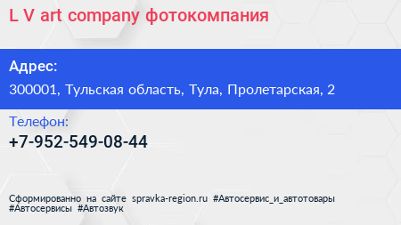 L & V art company, фотокомпания по адресу 300001, Тульская область, Тула, Пролетарская, 2 в дальнейшем Организация, размещена в следующих категориях: