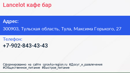 Lancelot, кафе-бар по адресу 300903, Тульская область, Тула, Максима Горького, 27 в дальнейшем Организация, размещена в следующих категориях:
