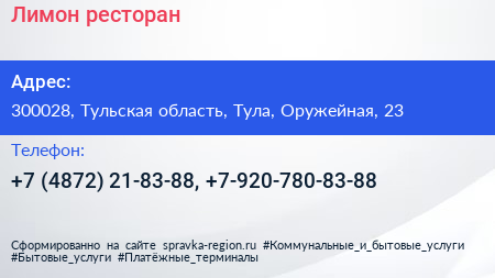 Лимон, ресторан по адресу 300028, Тульская область, Тула, Оружейная, 23 в дальнейшем Организация, размещена в следующих категориях: