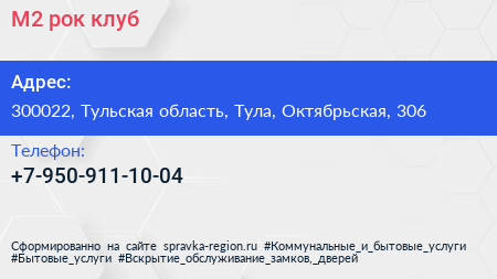 М2, рок-клуб по адресу 300022, Тульская область, Тула, Октябрьская, 306 в дальнейшем Организация, размещена в следующих категориях: