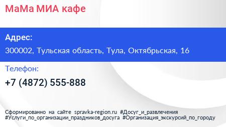 MaMa МИА, кафе по адресу 300002, Тульская область, Тула, Октябрьская, 16 в дальнейшем Организация, размещена в следующих категориях: