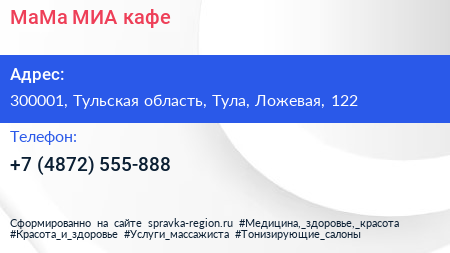 MaMa МИА, кафе по адресу 300001, Тульская область, Тула, Ложевая, 122 в дальнейшем Организация, размещена в следующих категориях: