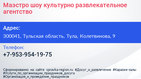 Маэстро шоу, культурно-развлекательное агентство по адресу 300041, Тульская область, Тула, Колетвинова, 9 в дальнейшем Организация, размещена в следующих категориях: