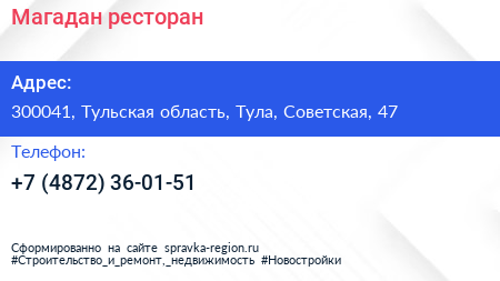 Магадан, ресторан по адресу 300041, Тульская область, Тула, Советская, 47 в дальнейшем Организация, размещена в следующих категориях: