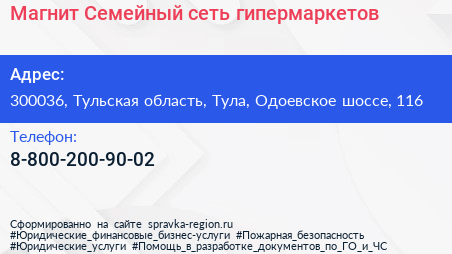 Магнит Семейный, сеть гипермаркетов по адресу 300036, Тульская область, Тула, Одоевское шоссе, 116 в дальнейшем Организация, размещена в следующих категориях: