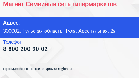 Магнит Семейный, сеть гипермаркетов по адресу 300002, Тульская область, Тула, Арсенальная, 2а в дальнейшем Организация, размещена в следующих категориях: