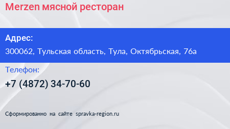 Merzen, мясной ресторан по адресу 300062, Тульская область, Тула, Октябрьская, 76а в дальнейшем Организация, размещена в следующих категориях:
