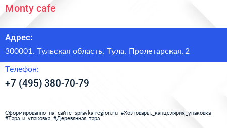 Monty cafe по адресу 300001, Тульская область, Тула, Пролетарская, 2 в дальнейшем Организация, размещена в следующих категориях: