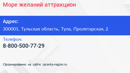 Море желаний, аттракцион по адресу 300001, Тульская область, Тула, Пролетарская, 2 в дальнейшем Организация, размещена в следующих категориях: