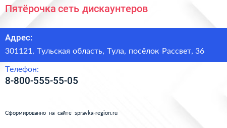 Пятёрочка, сеть дискаунтеров по адресу 301121, Тульская область, Тула, посёлок Рассвет, 36 в дальнейшем Организация, размещена в следующих категориях: