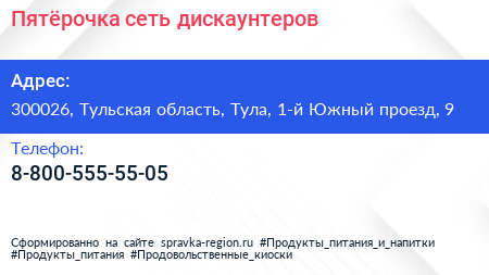 Пятёрочка, сеть дискаунтеров по адресу 300026, Тульская область, Тула, 1-й Южный проезд, 9 в дальнейшем Организация, размещена в следующих категориях:
