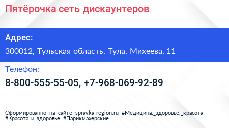 Пятёрочка, сеть дискаунтеров по адресу 300012, Тульская область, Тула, Михеева, 11 в дальнейшем Организация, размещена в следующих категориях: