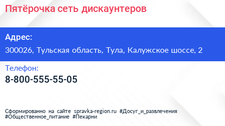 Пятёрочка, сеть дискаунтеров по адресу 300026, Тульская область, Тула, Калужское шоссе, 2 в дальнейшем Организация, размещена в следующих категориях:
