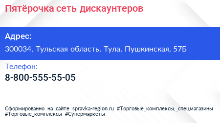 Пятёрочка, сеть дискаунтеров по адресу 300034, Тульская область, Тула, Пушкинская, 57Б в дальнейшем Организация, размещена в следующих категориях: