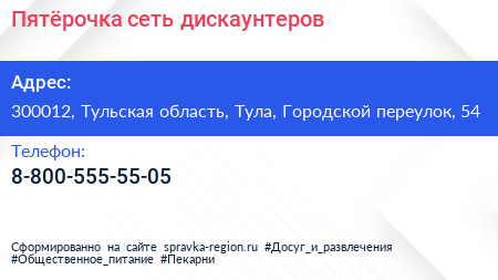 Пятёрочка, сеть дискаунтеров по адресу 300012, Тульская область, Тула, Городской переулок, 54 в дальнейшем Организация, размещена в следующих категориях: