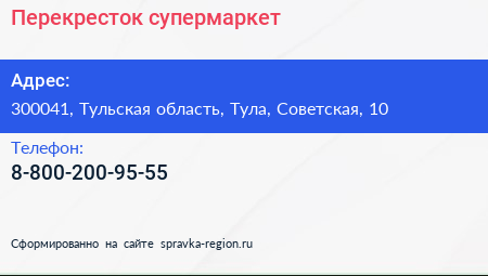Перекресток, супермаркет по адресу 300041, Тульская область, Тула, Советская, 10 в дальнейшем Организация, размещена в следующих категориях: