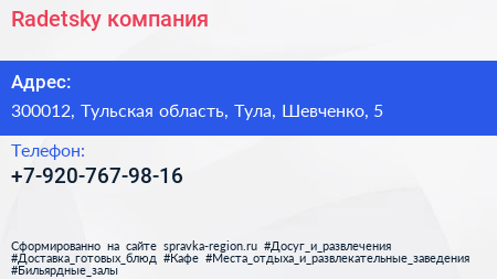 Radetsky, компания по адресу 300012, Тульская область, Тула, Шевченко, 5 в дальнейшем Организация, размещена в следующих категориях: