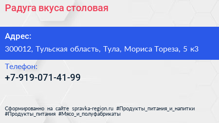 Радуга вкуса, столовая по адресу 300012, Тульская область, Тула, Мориса Тореза, 5 к3 в дальнейшем Организация, размещена в следующих категориях: