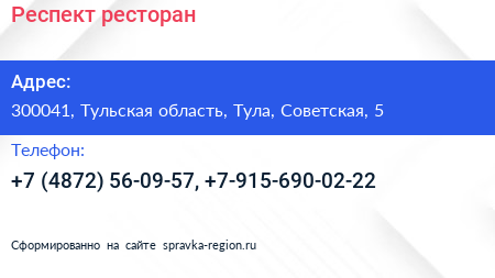 Респект, ресторан по адресу 300041, Тульская область, Тула, Советская, 5 в дальнейшем Организация, размещена в следующих категориях: