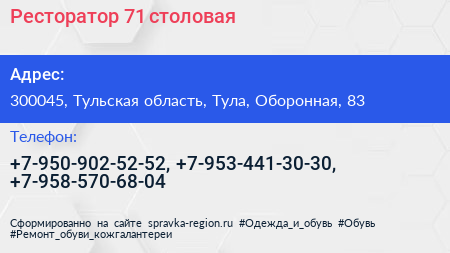 Ресторатор-71, столовая по адресу 300045, Тульская область, Тула, Оборонная, 83 в дальнейшем Организация, размещена в следующих категориях: