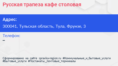 Русская трапеза, кафе-столовая по адресу 300041, Тульская область, Тула, Фрунзе, 3 в дальнейшем Организация, размещена в следующих категориях: