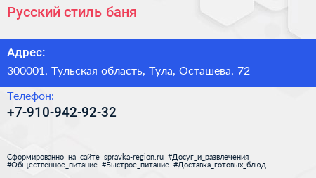 Русский стиль, баня по адресу 300001, Тульская область, Тула, Осташева, 72 в дальнейшем Организация, размещена в следующих категориях:
