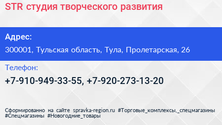STR, студия творческого развития по адресу 300001, Тульская область, Тула, Пролетарская, 26 в дальнейшем Организация, размещена в следующих категориях: