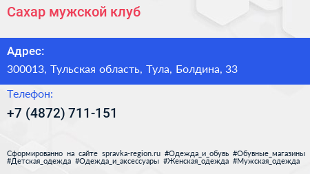 Сахар, мужской клуб по адресу 300013, Тульская область, Тула, Болдина, 33 в дальнейшем Организация, размещена в следующих категориях: