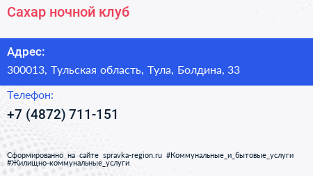 Сахар, ночной клуб по адресу 300013, Тульская область, Тула, Болдина, 33 в дальнейшем Организация, размещена в следующих категориях: