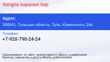 Sangria, караоке-бар по адресу 300041, Тульская область, Тула, Каминского, 24в в дальнейшем Организация, размещена в следующих категориях: