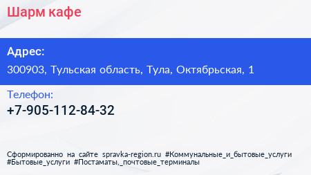 Шарм, кафе по адресу 300903, Тульская область, Тула, Октябрьская, 1 в дальнейшем Организация, размещена в следующих категориях: