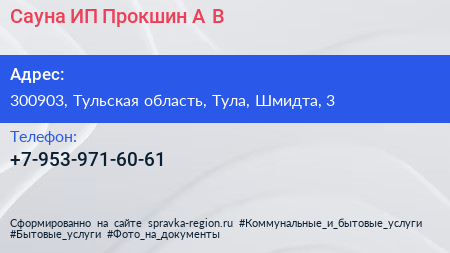 Сауна, ИП Прокшин А.В. по адресу 300903, Тульская область, Тула, Шмидта, 3 в дальнейшем Организация, размещена в следующих категориях: