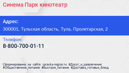 Синема Парк, кинотеатр по адресу 300001, Тульская область, Тула, Пролетарская, 2 в дальнейшем Организация, размещена в следующих категориях: