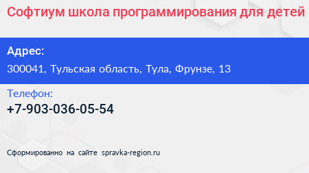 Софтиум, школа программирования для детей по адресу 300041, Тульская область, Тула, Фрунзе, 13 в дальнейшем Организация, размещена в следующих категориях: