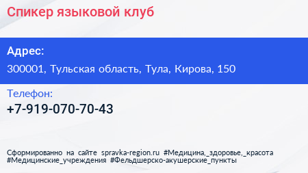 Спикер, языковой клуб по адресу 300001, Тульская область, Тула, Кирова, 150 в дальнейшем Организация, размещена в следующих категориях: