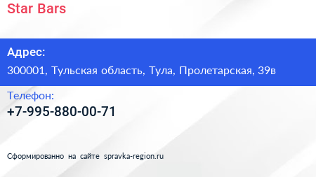 Star Bars по адресу 300001, Тульская область, Тула, Пролетарская, 39в в дальнейшем Организация, размещена в следующих категориях: