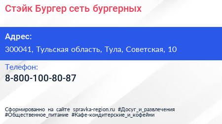 Стэйк & Бургер, сеть бургерных по адресу 300041, Тульская область, Тула, Советская, 10 в дальнейшем Организация, размещена в следующих категориях: