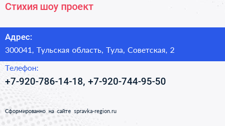 Стихия, шоу-проект по адресу 300041, Тульская область, Тула, Советская, 2 в дальнейшем Организация, размещена в следующих категориях: